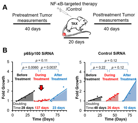 Spontaneous tumor growth is suppressed by NF-kB targeted therapy. (A) Scheme of tumor growth monitoring. (B)Tumor growth doubling time before, during, and after treatment of NF-κB inhibitory siRNA nanoparticle treated group (left) or control siRNA nanoparticle group (right).