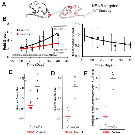 BNX mice implanted with tumor cell homogenates from primary TAX-LUC tumors were treated (2 i.v. injections per week for 5 weeks) with p65/p100 siRNA loaded nanoparticles (n = 6) vs. free siRNAs as control (n = 4) (Figure 3A). Tumor size caliper measurements were obtained over the course of 40 days and at the endpoint by ultrasound. The growth rate of tumors treated with p65/p100 siRNA was significantly reduced compared to control untreated mice (Figure 3B). Moreover, tumor size, spleen size, and peripheral blood lymphocyte counts were significantly lower in treated mice compared to controls (Figure 3C–E). The fold change in tumor growth in mice treated with the NF-κB inhibitory siRNA nanoparticles was 1.35 ± 0.08, while that of control mice was 2.07 ± 0.08, p = 0.0015. Tumor bearing mice develop enlarged spleens. By normalizing the spleen size to the average spleen size of the treatment group (1.00 ± 0.15), the spleens in the control mice (2.29 ± 0.19) were significantly larger than that in treatment group, p < 0.01. Peripheral blood lymphocyte counts also were affected by NF-κB inhibitory siRNA nanoparticles such that the treatment group counts were 1.04 ± 0.30 (103 cells/µL) as compared to the control group (2.84 ± 0.22 (103 cells/µL), p < 0.01). Taken together these data demonstrated that p5RHH mediated delivery of siRNA targeting p65/p100 suppressed local tumor growth and systemic manifestations of tumor growth in vivo.