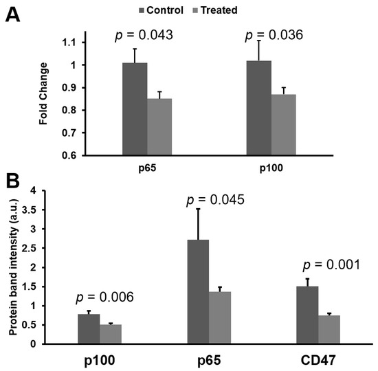Forty eight hours after the last NF-κB inhibitory nanoparticle dose as described above, tumors were excised for evaluation of mRNA and protein expression. The RT2-PCR results demonstrated that NF-κB inhibitory nanoparticle loaded with both p65 and p100 siRNA significantly inhibited p65 (0.85 ± 0.03) and p100 (0.86 ± 0.03) mRNA in treated group, as compared with control group (p65: 1.01 ± 0.06, p = 0.043; p100: 1.02 ± 0.09, p = 0.032) (Figure 4A). Western blot results confirmed that nanoparticles loaded with both p65 and p100 siRNA significantly reduced p65 (p65: 1.36 ± 0.12) and p100 (0.52 ± 0.03) protein expression in the treated group, as compared with the control group (p65: 2.72 ± 0.80, p = 0.045; p100: 0.78 ± 0.09, p = 0.006) (Figure 4B). Moreover, for the nanoparticle treated mice, the CD47 (“Do not eat me”) signal was reduced (0.75 ± 0.06), as compared with that in control mice (1.51% ± 0.19) (p = 0.001) (Figure 4B). CD47 is an overexpressed surface protein expressed by many different types of cancer cells, including hematological malignancies [63], which prevents clearance by phagocytic cells. It has been reported that overexpression of CD47 is mediated by NF-κB in breast cancer cells [64] and glioblastoma cells [65]. Additionally, NF-κB up-regulated CD47 expression is associated with sorafenib resistance in hepatocellular carcinoma [66]. This is the first report to our knowledge that local inhibition of NF-κB in ATLL might reduce CD47 expression and could serve to prime the immune system to facilitate adjunctive anti-cancer treatments.