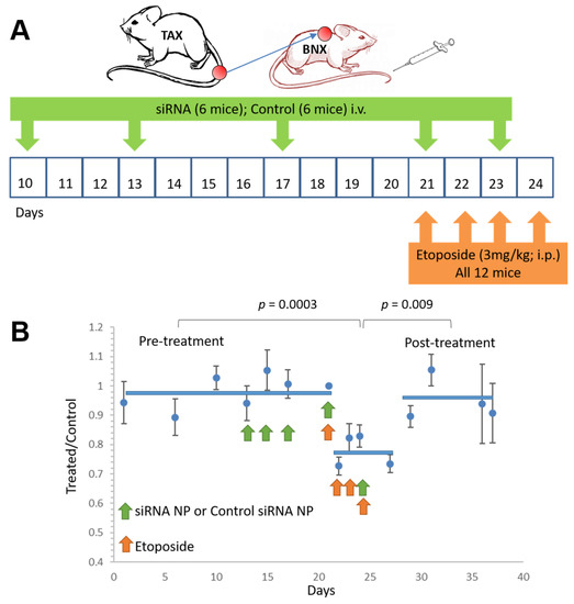 Anti-NF-kB siRNA nanoparticles sensitize tumors to traditional chemotherapy. (A) Scheme of treatment schedules. There are two groups with six mice each receiving NF-κB inhibitory nanoparticle with siRNA of p65 and p100, or saline injection as control and then all 12 mice were received etoposide treatment. (B) Tumor growth was measured in BNX mice injected subcutaneously with tumor cells from primary TAX-LUC tumors treated with saline (control) or NF-κB inhibitory nanoparticle treatment (siRNA) and then with etoposide.
