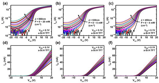 Transfer characteristics of a-Si:H TFTs under illumination of 660, 530, and 450 nm lasers in (a–c) log and (d–f) linear scale. Various optical intensities (0~5 mW cm–2) were applied to a-Si:H TFTs with the same distance and angle.