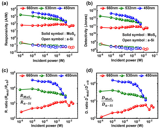One of the most important figures of merit for a photodetector is its external photoresponsivity and detectivity. To quantitatively compare the performance of photoresponse, both photoresponsivity and detectivity were extracted and shown in Figure 4. The photoresponsivity and detectivity were calculated from equations R = Iphoto/Plight, D = R × S1/2(2qIdark)1/2, where P is a total incident optical power, S is the effective illuminated area, q is the electron charge, and Idark is dark current. Iphoto and Idark are the current levels in the off regime, for the bias condition, at VGS = −1.2 V for m-MoS2 TFTs and VGS = −1.5 V for a-Si:H TFTs, respectively, under either light illumination or dark condition. Figure 4a shows extracted photoresponsivity of m-MoS2 and a-Si:H TFTs. The photoresponsivities of the m-MoS2 TFTs ranged from 102 to 104 for RGB light, and those of the a-Si:H TFTs were within 10−1, wherein the responsivities of the a-Si:H TFTs were similar regardless of the wavelength as reported in the literature [31]. In the all of wavelengths and optical power ranges, the m-MoS2 TFTs exhibited 2~5 orders larger responsivities than that of the a-Si:H TFTS, which is attributed to different photocurrent value for both TFTs. In addition, Figure 4b presents the detectivity of the m-MoS2 and a-Si:H TFTs, from which detectivities of the m-MoS2 TFTs were 1011~1013 and those of the a-Si:H TFTs were extracted as 108~109. Due to the noticeable current ratio between Iphoto and Idark, the m-MoS2 TFTs had clearly higher detectivities than a-Si:H TFTs. As a result, in the all of wavelength and optical power range, the m-MoS2 TFTs exhibited 2~4 orders larger detectivities. The overall quantitative comparison of responsivities and detectivities for the m-MoS2 and a-Si:H TFTs are summarized in Figure 4c,d, which obviously confirms a much better performance of MoS2 photodetector.