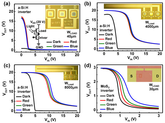 Voltage transfer characteristics of a-Si:H DLED inverters with (a) 40 μm, (b) 4000 μm, and (c) 8000 μm of Wload under illumination from dark to blue. (d) Voltage transfer characteristics of m-MoS2 DLED inverters with 30 μm Wload. Insets show optical image of a-Si:H and m-MoS2 TFTs with each channel dimension.