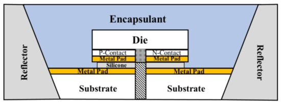 The semiconductor die bonder employed was a conventional Mech-EI manual die bonder. A commercially available liquid dielectric adhesive was used to fill the valleys on the interconnecting surfaces, and then subsequently cured in an oven at a temperature of 150 °C for one and half hours. The encapsulation of the die-package was through a commercially available silicone resin (Dow Inc., Midland, MI, USA, and the encapsulation was completed by another thermal curing at 150 °C for two hours. The packaged device was then soldered to an Al-based printed-circuit-board before performing any property measurements. The BLT value of the two sets of devices was the same, which was controlled around 100 ± 5 nm. Figure 2 shows the cross-sectional view of the whole package.