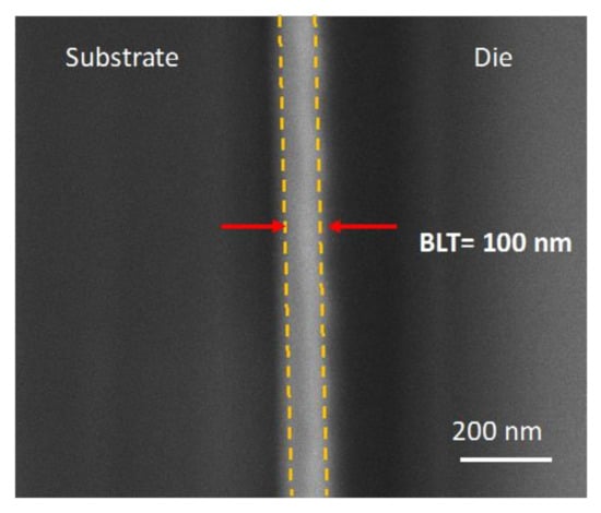 The cross-sectional SEM images were taken at various different locations along the die–substrate bonding layer for each sample and the mean was taken to estimate the BLT value, marked with yellow dashed lines in Figure 4. Most of the heights of the peaks and valleys on the metallic pads of die and substrate were between 0–20 nm according to the AFM measurements (see Figure 3). Therefore, the boundary of the BLT looked quite flat in the SEM images.
