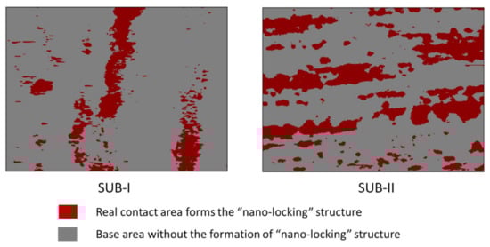 Since the BLTs of the two packages were controlled the same, the surface morphology of the metallic pads on semiconductor die was the same, therefore, the overall bonding layer using the substrate type II (SUB-II) had a larger total contact number and contact area compared with the case using the substrate type I (SUB-I). The real contact areas are defined as when the ridges (positive surface height) and valleys (negative surface height) on the surface roughness of two bonding surfaces make contact with each other and form the electrical/thermal conduction within the desired BLT (BLT = 100 ± 5 nm in this case). Based on the AFM analysis shown in Figure 3, each ridge/valley on the scanning area of the surface has a responding height and their location can be described with unique coordinate. Then, the coordinate of the whole effective area can be acquired and plotted by using the “contour” function by Matplotlib, as shown in Figure 5. Figure 5 shows the distribution of the real effective contact area (red area) on the two different package substrates within the scanning area, which forms the “nano-locking” structure under the same BLT.