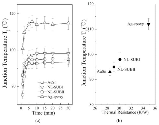 Figure 7 presents the thermal performance for the devices made by the NL approach with different substrates and two conventional die–substrate bonding methods. Figure 7a presents the measurements of the die junction temperature ( of packaged devices. It is evident that the device made by the NL bonding method with substrate type I (SUB-I) was about 3 °C higher than the devices made by substrate type II (SUB-II). In addition, the junction temperature ( of devices using the NL bonding method with substrate type II (SUB-II) was about 2 °C higher than that of the AuSn bonding, and about 19 °C lower than the Ag-epoxy bonding.