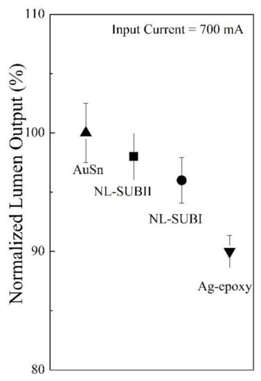 Figure 8 presents the optical performance in terms of normalized lumen output at the suggested maximum input current of 700 mA for the devices made by the NL bonding method with different substrates and the comparison to two conventional die–substrate bonding methods. It is obvious that the lumen output for the devices made by NL bonding with package substrate type II (SUB-II) was enhanced about 2% higher compared with the devices using package substrate type I (SUB-I). This is fully consistent with the prior results on the dependence of and on the total contact number and contact area under the same BLT. In addition, the lumen output for the devices made by the NL bonding approach with package substrate type I (SUB-I) was about 6% higher than the Ag-epoxy bonding, and about 4% lower than AuSn bonding.