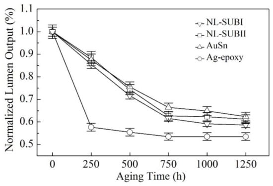 Figure 9 presents a comparison of the aging time-dependent lumen maintenance of the devices made with the NL approach with different substrates and the other two conventional methods under the industrial standard condition of high chamber temperature of 85 °C and high relative humidity of 85% for a total duration of 1250 h. The y-axis represents relative change in the lumen maintenance normalized to the initial lumen output. The x-axis represents the aging or stressing time. It is evident that at the aging time of 1250 h, in the devices made by the NL bonding method, the lumen maintenance using package substrate type II (SUB-II) was about 3% higher than the devices using package substrate type I (SUB-I). The lumen maintenance of the packaged LEDs made by NL with packaged substrate type I (SUB-I) was about 4% lower than the device made by AuSn bonding and about 5.1% higher than the device made by the Ag-epoxy bonding. The superior reliability associated with the NL bonding method with package substrate type II (SUB-II) compared with the devices using package substrate type I (SUB-I) evidently resulted from the observed reduced electrical resistance as well as a reduction in thermal resistance, as discussed above.