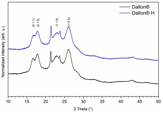 The X-ray diffraction patterns of hydrophobic (Dallon®) and hydrophilic (Dallon® H) prostheses are presented in Figure 2. Figure 2 shows numerous broad reflections associated with the semi-crystalline structure of both materials. The broad band located in the range of 15–27° is related to the amorphous halo and represented the amorphous structure of the polymer.