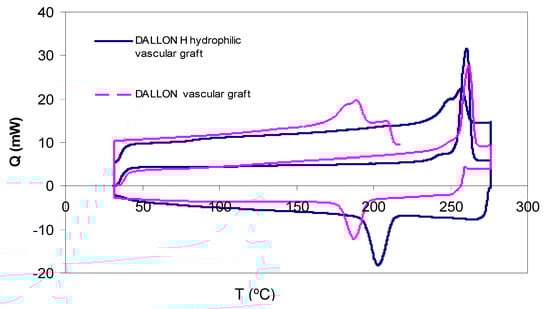 The overlay diagram of DSC thermograms of Dallon® and Dallon® H vascular prostheses in the temperature range of 32–280 °C; an increase and decrease in temperature is shown in Figure 4. The diagrams of DSC both for Dallon® or Dallon® H vascular prostheses during an increase and decrease in temperature did not show any differences. A similar melting temperature (259 °C or 260 °C) as well as a similar crystallization temperature were found. The phenomenon above confirms the presence of a similar polymer in both studied vascular prostheses. The DSC results for Dallon® H or Dallon® vascular prostheses are shown in Table 2.