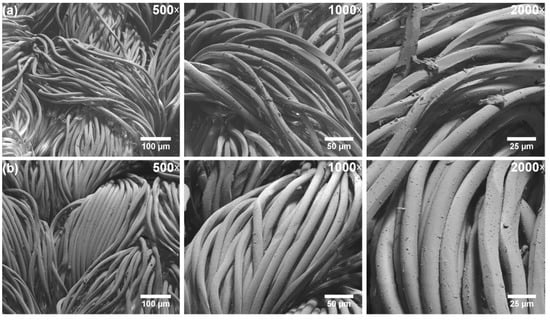 Representative low magnification SEM images of the (a) Dallon® and (b) Dallon® H vascular prostheses recorded for 500-, 1000- and 2000-times magnification, respectively.