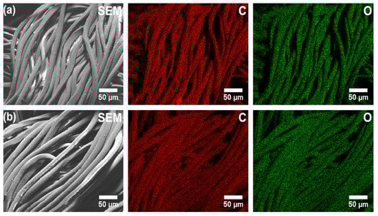 The next step of Scanning electron microscopy with energy dispersive X-ray spectroscopy (SEM-EDS) investigation was the analysis of the elemental mapping, which was performed in order to reveal the distribution of elements in the samples. The EDS mapping of knitted prosthesis surfaces (see Figure 6) shows that carbon (red colour) and oxygen (green colour) are uniformly distributed.