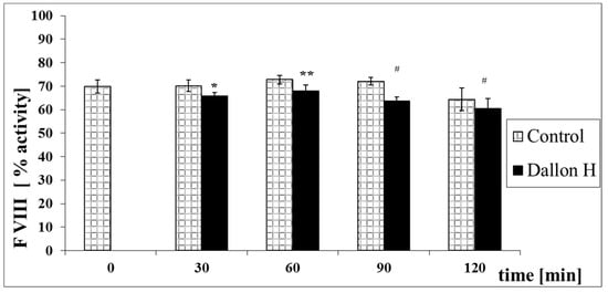 Factor VIII (FVIII) activity. * p < 0.05, ** p < 0.01 to the control group. # p < 0.05 to the primary value.