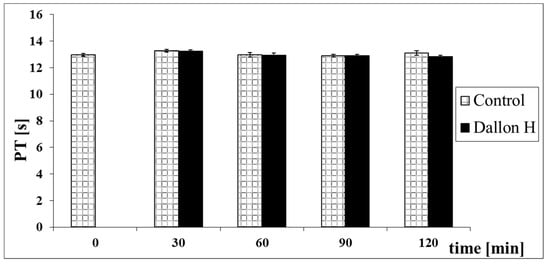 Based on the previously conducted research [20] of polyester knitted fabrics with a hydrophilic surface, for which the greatest changes were found between 30 and 120 min, the Dallon® H vascular prosthesis was assessed in this respect. The values of the coagulation system parameters obtained in our research after this contact time are comparable with the values obtained for hydrophilic polyester knitted fabrics.