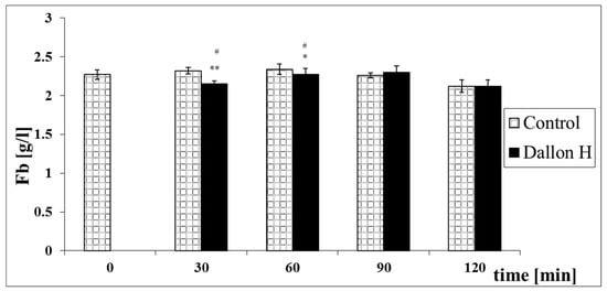 Fibrinogen concentration (Fb). * p < 0.05, ** p < 0.01 to the control. # p < 0.05 to the primary value.