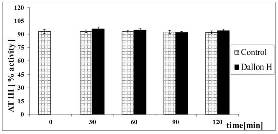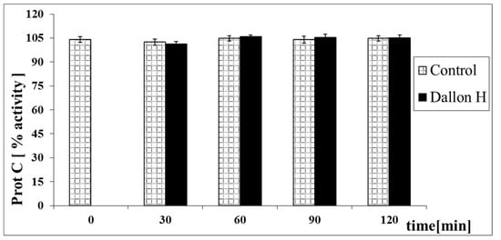 Mean coagulation system parameter values with control plasma and studies with standard deviation as well as the level of significance are given in Figure 7, Figure 8, Figure 9, Figure 10, Figure 11, Figure 12, Figure 13, Figure 14, Figure 15, Figure 16 and Figure 17. After blood contact with Dallon® H vascular prosthesis in the plasma, an important lengthening of a APTT value by 6% (p < 0.01) and11% (p < 0.001) after 30 and 60 min and 13% (p < 0.001) after 90–120 min, respectively, was observed in relation to the control value. The lengthening of the APTT showed an important difference (p < 0.001) in relation to the primary value (time 0). The biggest lengthening, by an average of 13%, was observed in 90–120 min (Figure 7). Factor XII (FXII) activity in the plasma had an important decrease by 5% (p < 0.01) and 3% (p < 0.05) after 30 and 60 min in relation to the control group. After 90 and 120 min, F XII decreased activity by 6% (p < 0.001) in relation to the control and primary value (Figure 8). Factor IX (FIX) activity had an important decrease by 8% (p < 0.01) after 30, 60 and 90 min and by 14% (p < 0.01) after 120 min in relation to the control group. Factor IX activity had an important decrease by 12% (p < 0.01, p < 0.001) after 30 and 60 min and 17% (p < 0.01) after 90 and 120 min compared to the primary value (Figure 9). Factor VIII activity had an important decrease by 6% (p < 0.05) after 30 and 60 min and by 10% (p < 0.01) after 90 min in relation to the control value. After 90 min, at 120 min, an important decrease by 11% (p < 0.05) was observed in relation to the primary value (Figure 10). The prothrombin time and prothrombin ratio in the plasma in all measurement periods were within the control group and primary values (Figure 11 and Figure 12). The thrombin time (TT) had important lengthening by 3% (p < 0.05) after 30 min and 60 min in relation to the control group value. TT values obtained in the measurement period of 90–120 min compared to the primary value can be seen in Figure 13. The fibrinogen concentration in the plasma had an important decrease by 8% (p < 0.01) after 30 min and by 3% (p < 0.05) after 60 min in relation to the control value. Fibrinogen values had an important decrease by 5% (p < 0.05) after 30 min in relation to the primary value (Figure 14). Plasminogen activity in all measurement periods showed no important difference compared to the control group value and was close to the primary value (Figure 15). Antithrombin III activity and protein C activity in the plasma in all measurement periods and in the control group was close to the primary value. The obtained values in those observation periods were at comparable levels (Figure 16 and Figure 17).