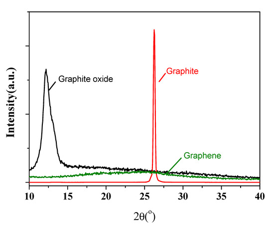 The XRD patterns for the natural graphite powder, Staudenmaier GO and GN reduced at 1100 °C, are displayed in Figure 1. The (002) peak of graphite shifts significantly from 26.3° to 12.3° after oxidation with acid treatment. This indicates a much larger interlayer spacing due to the intercalation of acid. The successful exfoliation of graphene sheets can be verified by the vanishing of (002) peak in GN after the thermal reduction step. The BET specific surface area for GN calculated from nitrogen adsorption isotherm (not shown) was 517 m2/g, which also confirmed that a high degree of exfoliation was achieved. As in many applications of graphene in composite materials [35,36,37,38,39,40], a large specific surface area for the graphene filler and a highly uniform dispersion in the matrix are essential to ensure the optimal performance.