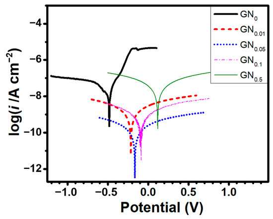 Potentiodynamic polarization curves for samples coated with epoxy added with various amounts (0, 0.01, 0.05, 0.1 and 0.5 wt.%) of GN.