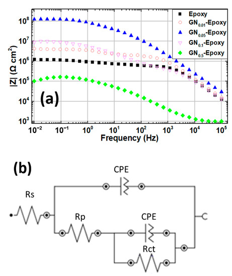 The electrochemical behavior and anticorrosion performance of the composite coatings were further investigated by EIS. Figure 3a displays the Nyquist plot of all coated samples immersed in 3.5 wt.% NaCl solution. The magnitude of the Nyquist arc is closely related to the corrosion resistance of the coating. The sizes of the Nyquist arcs vary so dramatically between samples that we cannot see the smaller curves in the diagram. To clearly show the smaller ones, we display successively zoomed-in plots in Figure 3b,c. Evidently the composite coating filled with GN0.05 outperforms the others in terms of anticorrosion by at least one order of magnitude. The corresponding Bode plot for all samples and the equivalent electric circuit for modeling are shown in Figure 4a,b, respectively. Several curves on the Bode plot clearly show two plateaus, implying that there are two time constants. The fitted equivalent circuit parameters, including the solution resistance (Rs), pore resistance (Rp) and charge transfer resistance (Rct), were extracted by the ZView® software Version 3.5a (Scribner Associates, Southern Pines, NC) and are summarized in Table 2. The magnitude of impedance at the low-frequency limit (|Z|0.01Hz) is regarded as a strong indicator for the barrier capability of the coating [7,10,12,25,27,41]. As can be seen from Bode plots, the |Z|0.01Hz value for the GN0.05 composite by about two orders of magnitude higher than that of pure epoxy. Even though when the loading content of GN increases to 0.1 wt.% or decreases to 0.01 wt.%, |Z|0.01Hz drops noticeably, it remains much higher than pure epoxy. Interestingly, GN0.5 performs even worse than pure epoxy, revealing the harmful effect of filler overload. At the optimum loading content of 0.05 wt.%, |Z|0.01Hz is as high as 1.2 × 108 Ω·cm2 (the corresponding value of pure epoxy coating is 1.2 × 106 Ω·cm2). All of these data acquired from the EIS measurements are in good agreement with the polarization curve analysis.