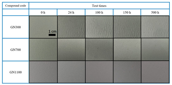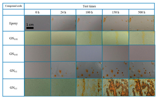 Visual appearance of samples (0.00, 0.01, 0.05, 0.1 and 0.5 wt.% of GN) following 0, 24, 100, 150 and 500 h of SST.