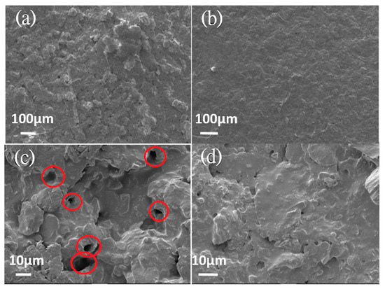 SEM images of the surface morphology for the coatings (a) without and (b) with GN fillers. (c,d) are the high-magnification images for (a,b), respectively.