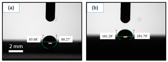 Water contact angle measurements for the epoxy resin coatings: (a) without GN; (b) with 0.05 wt.% of GN. (The scale bars for (a) and (b) are the same.).