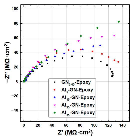 Nyquist plots of EIS for coatings filled with 0.05 wt.% of GN1100 and various contents (5, 15, 25 and 35 wt.%) of Al immersed in 3.5 wt.% NaCl solution.
