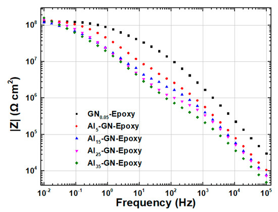 Bode plots of EIS for coatings filled with 0.05 wt.% of GN1100 and various contents (5, 15, 25 and 35 wt.%) of Al immersed in 3.5 wt.% NaCl solution.