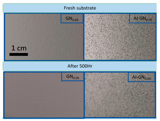 To verify the anticorrosion capability of the composite coating, the 500-h SST was also carried out. The visual appearances of the coating with Al25-GN0.05 fillers before and after SST are shown in Figure 17. The corresponding photographs for the GN-epoxy coating with the optimized condition are also displayed for comparison. Both coatings stayed intact after the test with no signs of rust or blistering, confirming their excellent corrosion resistance.