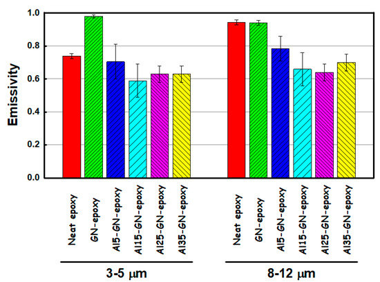 Average thermal emissivity values in the 3–5 and 8–12 μm windows for the neat epoxy, GN0.05-epoxy and Al-GN0.05-epoxy coatings with various Al contents (5, 15, 25 and 35 wt.%).