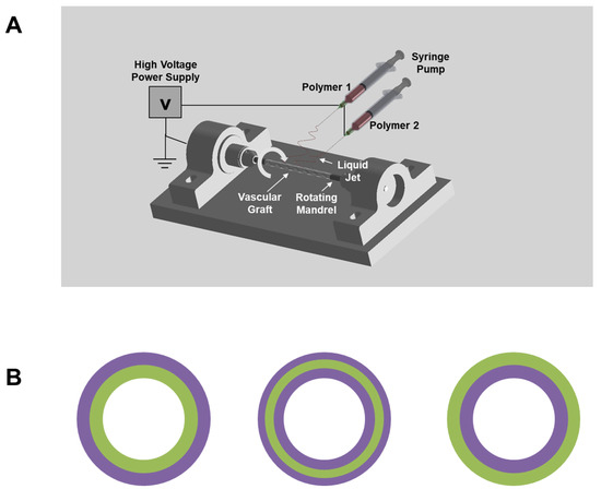 (A) Set-up of electrospinning of the vascular graft. Generally, a single polymer solution was eluted for multi-layered and single-layered vascular grafts, with the exception of co-electrospinning, in which two polymer solutions were eluted simultaneously. (B) Schematic design of multi-layered grafts, where PLCL is indicated by green color and PDO is indicated by purple color.