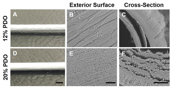 Characterization of electrospun microfibrous PDO vascular grafts. Gross structure (A,D, scale bar = 1 mm) and SEM images of microstructure of exterior (B,E, scale bar = 100 μm) and cross-section (C,F, scale bar = 100 μm) surface of PDO vascular grafts electrospun at 12% and 20% by weight.