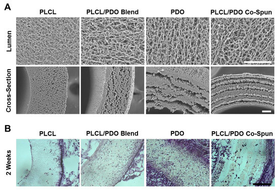 PLCL is an elastic and slow-degrading polymer, but electrospun PLCL grafts had low porosity and cell infiltration. Therefore, we investigated the possibility of using PDO as fast-degrading layer(s) in the fabrication of PLCL grafts: (1) PLCL as the luminal layer (~50 μm) and PDO as the exterior layer; (2) PDO as the luminal layer and PLCL as the exterior layer (~50 μm); (3) PLCL as the middle layer (~50 μm) and PDO as both the luminal and the exterior layer (Figure 1B).