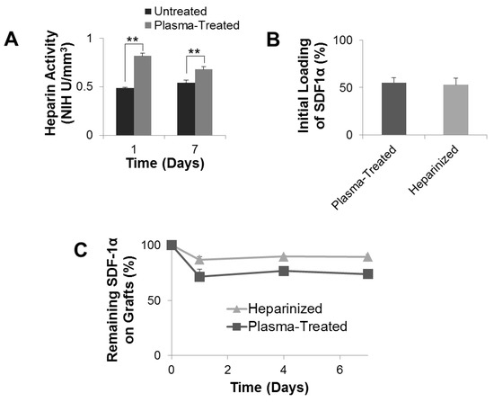 Quantification of heparin activity, SDF-1α initial loading, and release. (A) Activity of heparin passively absorbed onto untreated and heparin conjugated plasma-treated vascular grafts. (B) Initial loading of SDF-1α immobilized onto plasma-treated and heparinized vascular grafts. (C) The time course of SDF-1α release from plasma-treated and heparinized grafts. ** p < 0.01, (n = 3).