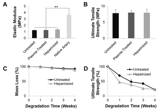 Mechanical and degradation characterization of microfibrous vascular grafts. (A) Elastic moduli of untreated, plasma-treated, heparinized vascular grafts, and native common carotid arteries. (B) UTS of untreated, plasma-treated, and heparinized vascular grafts. (C) Mass loss of untreated and heparinized vascular grafts during 4 weeks of hydrolysis in PBS under constant agitation. (D) Changes in the UTS of untreated and heparinized vascular grafts during 4 weeks of hydrolysis in PBS under constant agitation. ** p < 0.01, (n = 3).