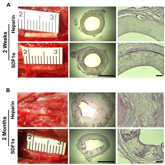 Tissue ingrowth and cell infiltration of vascular grafts. Vascular grafts explanted at (A) 2 weeks and (B) 2 months for the heparinized (top) and SDF-1α immobilized (bottom) group. Representative images of grafts in situ taken immediately prior to explantation (left) and H&E staining of the cross-section of explanted grafts at low (middle, scale bar = 1 mm) and high (right, scale bar = 100 μm) magnification.