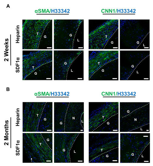 Identification and characterization of SMCs. Immunostaining for αSMA (green) and CNN1 (green) of heparinized and SDF-1α immobilized grafts at (A) 2 weeks and (B) 2 months after implantation. Nuclei were stained with Hoechst 33342 (blue). Dashed lines are used to distinguish the boundaries between L (lumen), N (neointima), G (graft), and T (surrounding tissues). Arrow indicates neovascularization on the outer surface of the grafts. Scale bar = 50 μm.