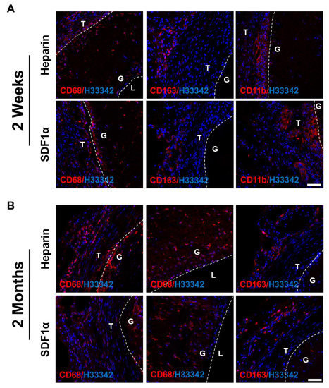 Inflammatory responses of vascular grafts. Immunostaining for CD68 (red), CD163 (red) and CD11b (red) of heparinized and SDF-1α immobilized grafts at (A) 2 weeks and (B) 2 months after implantation. Nuclei were stained with Hoechst 33342 (blue). Dashed lines are used to distinguish the boundaries between L (lumen), G (graft), and T (surrounding tissues). Scale bar = 50 μm.