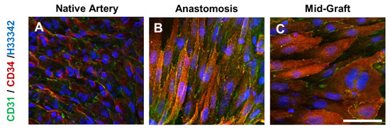 En face immunostaining for CD 31 (green) and CD34 (red) of the (A) native artery, and heparinized vascular grafts at 2 weeks after implantation at the (B) anastomotic and (C) mid-graft sites. Scale bar = 50 μm.