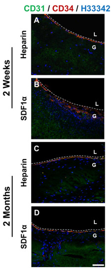 Immunostaining for CD 31 (green) and CD34 (red) of the cross-section of heparinized and SDF-1α immobilized grafts at (A, B) 2 weeks and (C, D) 2 months after implantation. Nuclei were stained with Hoechst 33342 (blue). Dashed lines are used to distinguish the boundaries between L (lumen), and G (graft). Scale bar = 50 μm.