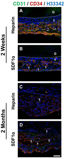 Identification and characterization of ECs and EPCs. Immunostaining for CD 31 (green) and CD34 (red) of the cross-section of heparinized and SDF-1α immobilized grafts at (A,B) 2 weeks and (C,D) 2 months after implantation. Nuclei were stained with Hoechst 33342 (blue). Dashed lines are used to distinguish the boundaries between G (graft), and T (surrounding tissues). Arrows indicate neovascularization on the outer surface of the grafts. Scale bar = 50 μm.