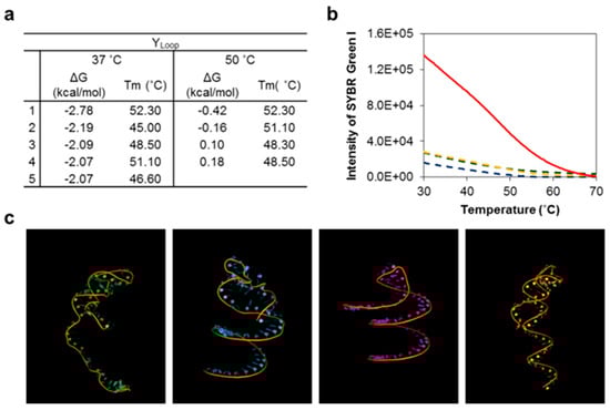 Empirical and theoretical analyses of possible secondary structures of L-DNA. (a) Theoretical analysis of the secondary structures of L-DNA via the Mfold program. YL, which contains a loop–stem form, exhibited possible secondary structures with high thermodynamic stability at both 37 °C and 50 °C. Both Gibbs free energy and Tm values of its secondary structures are described in the table. (b) Melting curves of Y1 (green), Y2 (blue), Y3 (orange), and YL (red) as measured by RT-PCR. The graph indicates changes in fluorescence intensity of SYBR green I, which is specific to double-stranded DNAs. Data were obtained from triplicate experiments. (c) Three-dimensional topographic images of four different types of possible secondary structures of YL at 50 °C.