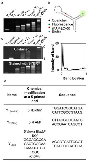 This outcome was also confirmed experimentally. Interestingly, YL alone showed stronger emission signals (~4-fold) than the other Yn at around 60 °C. No fluorescent emissions induced by detection were found from single components of the Yn samples. We studied this further using build-ups of single-stranded DNA fragments, including the complexes of Y1 + Y2, Y1 + YL, Y2 + YL, and Y1 + Y2 + YL (Figure S4). Most DNA constructs were synthesized below 60 °C (Tm = 56.5 °C). Production efficiency was investigated by varying temperatures around Tm (Figure S4b,c). Ideally, the binding fractions of oligo-fragments in each complex should be equal, and the total yield fraction should be 1.0. YL + Y1 and YL + Y2 had molar yield fractions of 0.76 and 0.53, respectively. The total proportion of unreacted fragments was 23.5% because the secondary structure of the longer YL fragment could inhibit the hybridization of complexes. This result was confirmed by single-stranded conformational polymorphism (SSCP) analysis through a gel-electrophoretic migration shift assay (GEMSA) using a 15% polyacrylamide gel (Figure 3) []. Staining of the gel with SYBR gold revealed that YL had adopted a secondary structure conformation, and that the complete set of L-DNA complexes was fragmented [,]. Both Y1 and Y2 appeared as single bands (Figure 3a), but YL was characterized by several bands, indicating potential secondary structures. After annealing, a set of DNA complexes involving Y1, Y2, YL, Y1 + Y2, Y1 + YL, and Y2 + YL were represented by several bands, indicating the secondary structures of these complexes. YL was specifically labeled with fluorescein (FAM), and roughly 62.6% of YL-containing product was obtained (Figure 3b,c). This result confirms that YL plays a significant role in product synthesis by competing with the formation of either secondary structures or products. To effectively recognize and capture a complementary RNA target, the loop structure of L-DNA was further examined (Figure 4). An open-close state of the loop on Y3 of L-DNA can be used for specific detection of an RNA target via fluorescence-resonance enhanced transfer (FRET), in which FRET signals are emitted as complementary RNA pairs with looped capture sequences (Figure 4). Working on-signaling may be strongly affected by environmental conditions such as target mass and reaction temperature. After L-DNA was synthesized, the Tm of the loop–stem structure was different from the as-expected Tm of 48 °C (Figure 4c); the Tm was around 37 °C, as determined by tracing the increase in the fluorescence of Cy5 as the fluorophore. In the case of the YL sequence, the Cy5 signal increased at around 45 °C. In contrast, L-DNA and its byproducts such as YL + Y1 and YL + Y2 exhibited an increased Cy5 signal at 37 °C, indicating that the loop–stem compartment was partially opened. This result implies that the loop–stem part of the L-DNA had a different thermal stability than YL alone. It is speculated that the detection resolution of L-DNA could be interrupted. It is strongly recommended not to use the L-DNA at temperatures below 30 °C. We also investigated that the yield of L-DNA formation increased at high salt concentrations (Figure S5).