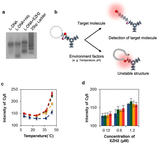 Thermal stability at 9, 16, 25, 37, and 45 °C was measured using a SpectraMax M5 (Molecular Devices, Sunnyvale, CA, USA). Thermal stability of 1.2 μM of L-DNA and its derivatives was measured in a 40 μL final volume on a 384-well plate. To investigate detection efficiency, 5 μL of 1.2, 0.6, and 0.12 μM complementary target mRNA EZH2 was added to 40 μL of L-DNA and its derivatives. After incubation for 30 min at 37 °C to allow binding to target molecules, fluorescence of the mixtures was measured using a SpectraMax M5. The Cy5 signal was measured at wavelengths of 648 nm and 675 nm. Fluorescence measurements were obtained from triplicate experiments and sample standard deviation was calculated for statistical evaluation.