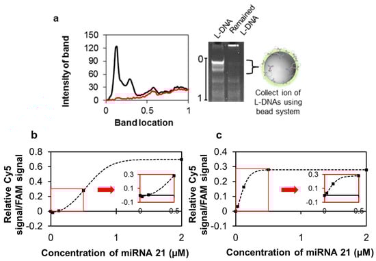 Construction of a bead-immobilized molecular beacon-equipped DNA nanosensor and its detection efficiency. (a) 15% PAGE image of the molecular-beacon-equipped DNA nanosensor (L-DNA) and the rest of L-DNAs. L-DNA was collected by 110 nm-sized PS beads via avidin–biotin conjugate chemistry. Red and black lines indicate L-DNAs and remaining L-DNAs, respectively. Minimum profile was used as a background signal; the purity of L-DNA increased from 58.4 to 86.8% when a solid support was used. (b) Detection efficiencies of free L-DNA and (c) the bead-immobilized L-DNA nanosensor system were compared. All data collected were obtained from triplicate experiments. The miRNA 21 was used at concentrations of 2, 0.5, 0.125, 0.03125, and used 0 μM as a negative control.