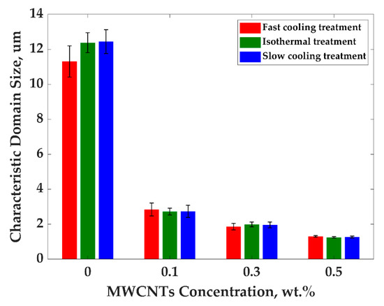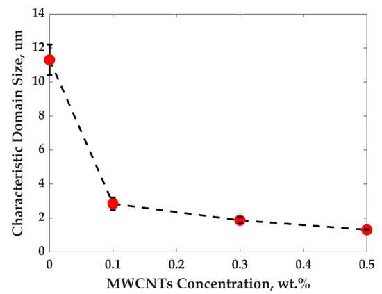 Characteristic domain size of PP/PS/MWCNTs composites after fast cooling as a function of MWCNTs concentration.