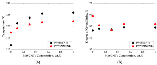 Figure 8a,b present the crystallization behavior of PP/MWCNTs and PP/PS/MWCNTs nanocomposites. The peak crystallization temperature (Tc) increases from 112 °C to 126 °C for PP/MWCNTs composites and from 117 to 122 °C for PP/PS/MWCNTs composites as the MWCNTs concentration is increased from 0 to 1 wt.% (Figure 8a). This increase in crystallization temperature originates from the nucleating effect of the MWCNTs. The effect is more pronounced for PP/MWCNTs composites as opposed to that of PP/PS/MWCNTs composites. This could be due to a favored location of the MWCNTs at the interface between both phases of the blends.