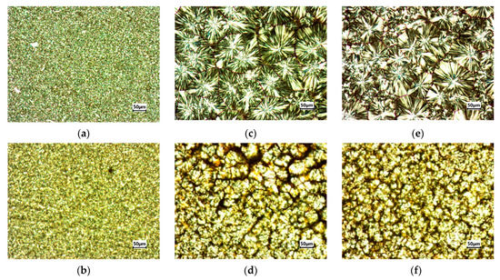 Microscopic observations of PP pure and PP/MWCNTs with 0.1 wt.% of MWCNTs for fast-cooling treatment (a,b); isothermal treatment (c,d); and slow-cooling treatment (e,f).