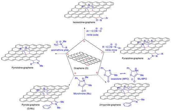 During the last decade, several groups have pioneered cycloaddition chemistry for the chemical modification of a wide array of carbon-based nanomaterials, including fullerene, carbon nanotubes, graphene, and carbon quantum dots, either in their pristine or functionalized forms [1,2,3,4,5]. The different cycloaddition strategies are an important tool to increase the processability, solubility, and colloid stability of nanostructures, to achieve better control over composition, and to target specific applications [6,7,8,9,10,11,12]. Among the different types of cycloaddition reactions employed for the covalent functionalization of the graphene sp2 network, it is arguable that the 1,3-dipolar cycloaddition (1,3-DC) and, in particular, the cycloaddition of azomethine ylides, is the most heavily used. The 1,3-DC of azomethine ylides on the graphene layer was exploited to introduce fused pyrrolidine rings on both the basal plane and the edge of the graphene sheet (Figure 1, pathway a). The dipole azomethine ylides were obtained by the condensation of an amino acid and an aldehyde under moderate–high temperature (above 80 °C) [13]. Although computational studies have predicted, in some cases, difficulties in the reaction progress on graphene for dipoles different from azomethine ylide, several successful examples of 1,3-DC reactions of different dipoles have been currently reported in the literature. The 1,2-heterobifunctionalized graphene was obtained by the reaction of nitrile oxides under microwave (MW) irradiation (Figure 1, pathway b) [14]. The formation of pyrazolines on graphene was achieved by 1,3-DC of nitrile imines (Figure 1, pathway c). The reaction proceeded by forming nitrile imine dipole intermediate obtained from the precursor hydrazones, in the presence of N-chlorosuccinimide [15].